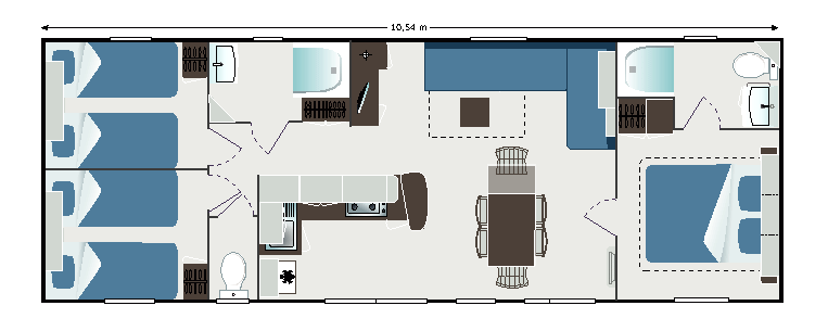 À l’intérieur, vous trouverez une cuisine équipée ouverte sur un salon spacieux avec banquette en L. Il est composé d’une chambre parentale avec lit double et de deux chambres avec lits jumeaux. Coté sanitaire, vous trouverez 2 salles d’eau et 2 toilettes pour plus de confort.