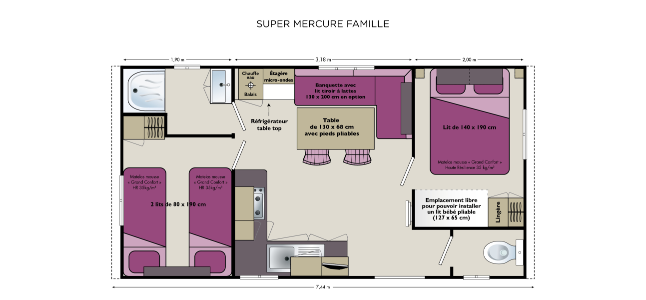 Venez découvrir ce mobil home composé d’un salon avec banquette en L ouvert sur une cuisine équipée, de 2 chambres, une première avec un lit double et une seconde avec lits superposés et un lit simpe. Salle de bain et WC séparés pour plus de confort.